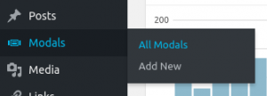 Now that the plugin is built upload it to your site and activate it through the plugins menu. When you activate it a new menu item will appear in the sidebar of the dashboard ‘Modal’.